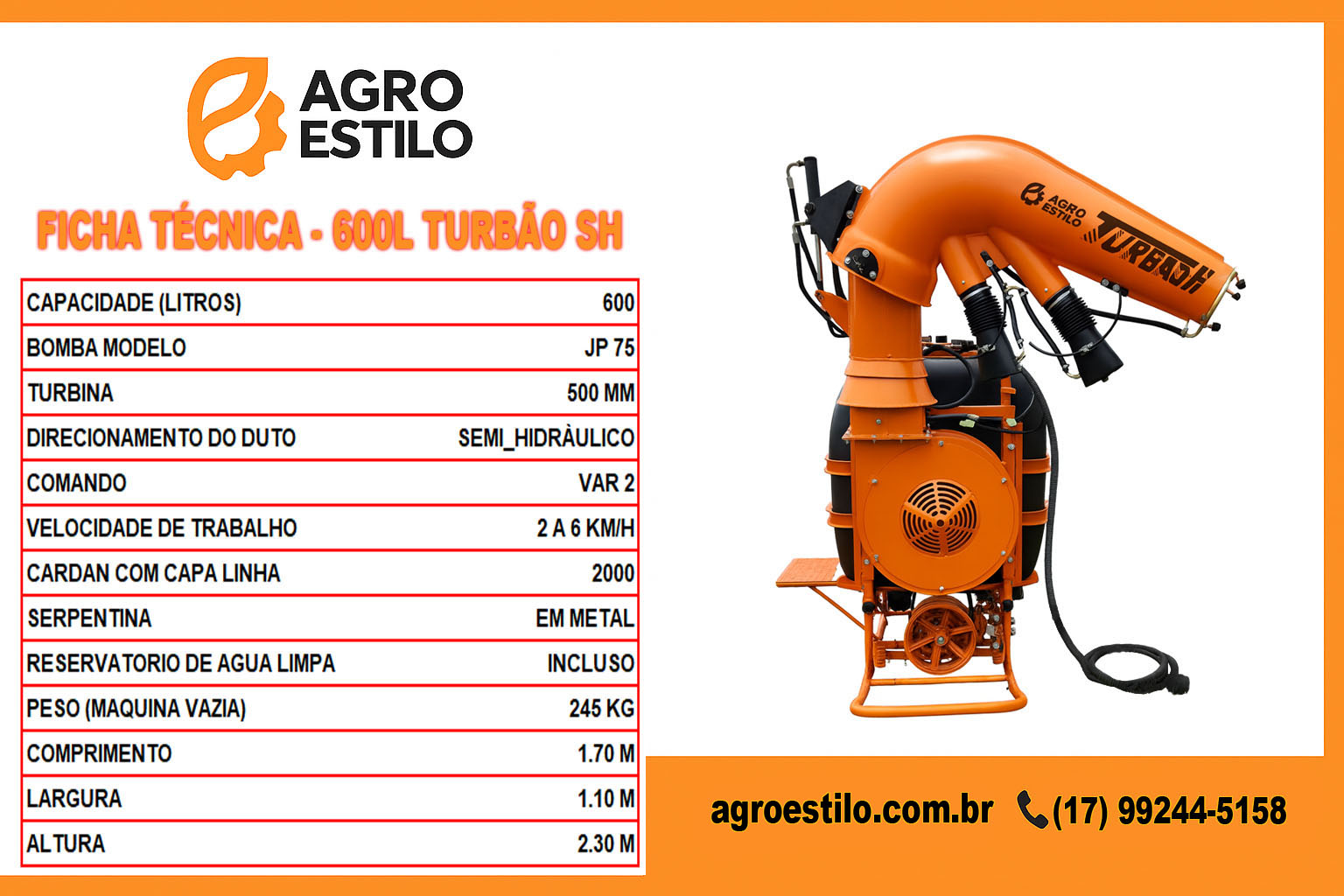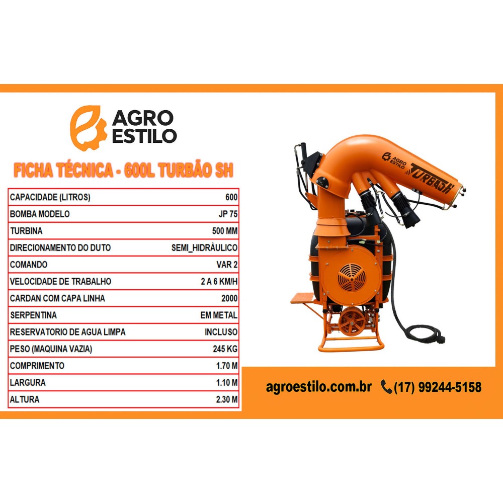 O Atomizador AGRO ESTILO 600 litros é o equipamento ideal para quem busca eficiência, durabilidade e precisão na pulverização agrícola. Seu tanque de 600 litros em polietileno de alta resistência garante leveza e longa vida útil, enquanto o reservatório de água limpa facilita a manutenção e a limpeza do sistema.